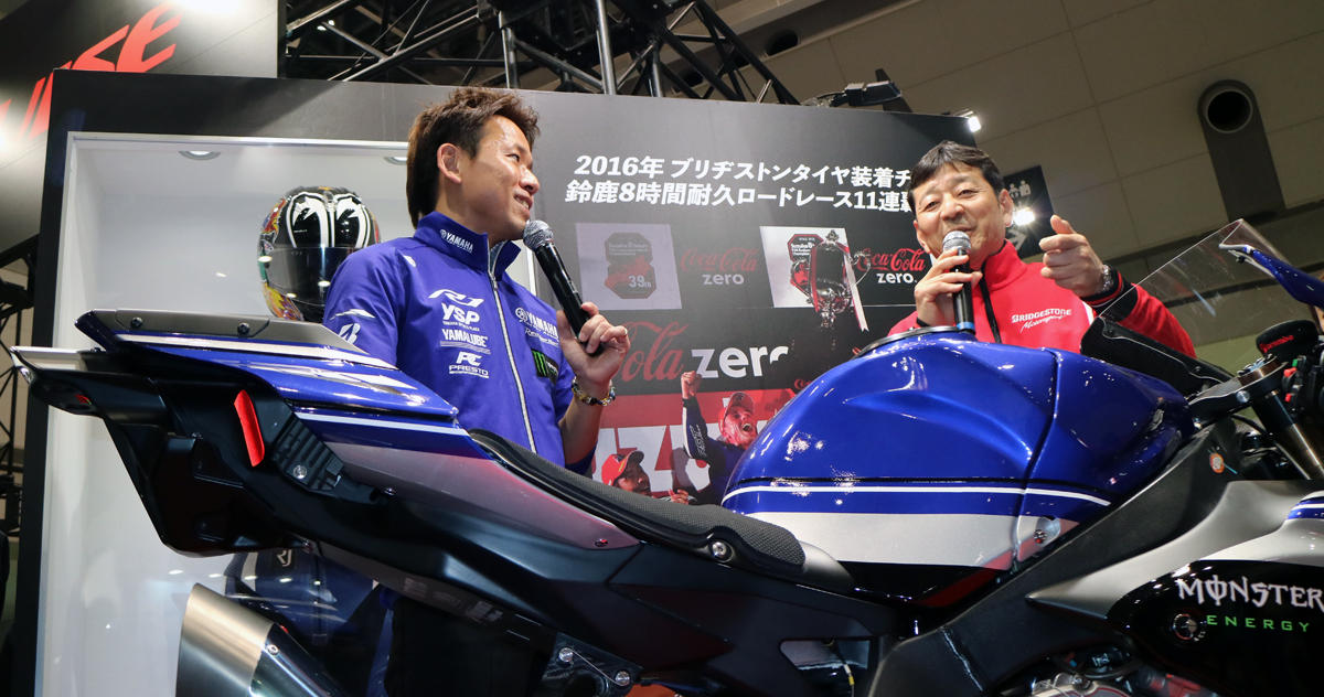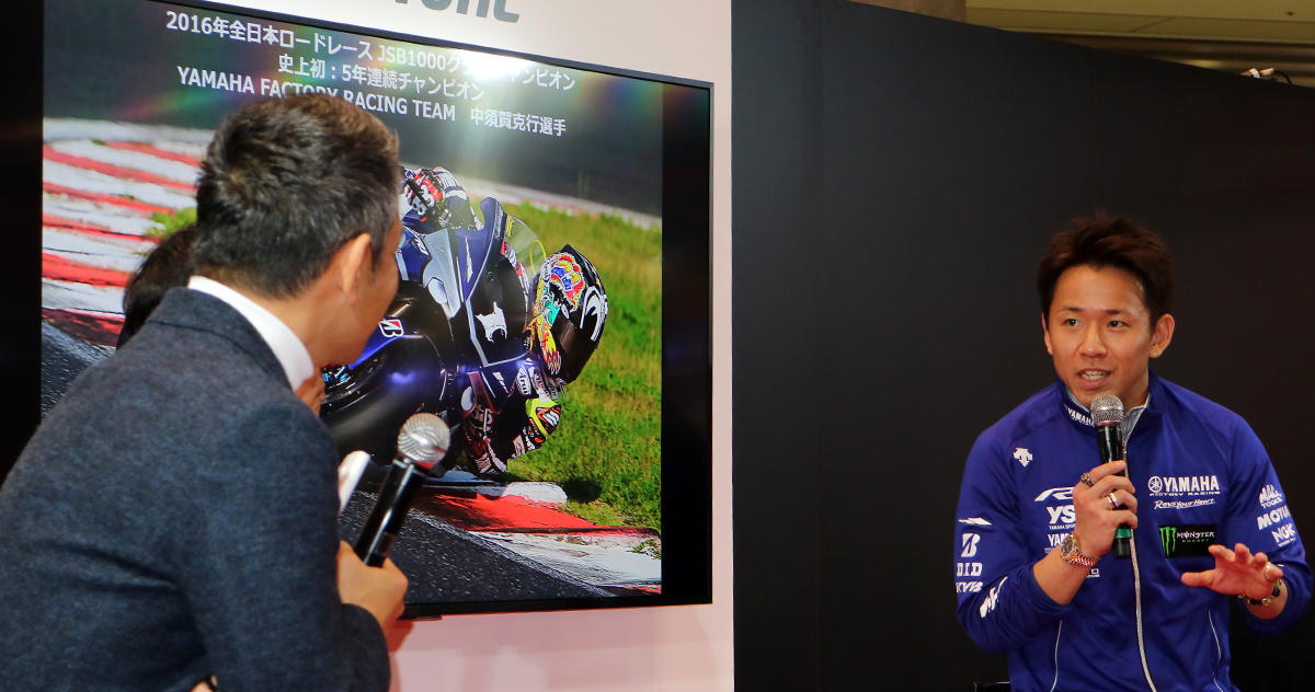 そして、25日(土)、26日(日)には、前人未到の全日本ロードレース最高峰JSB1000クラスで5年連続チャンピオン、そして2年連続で鈴鹿8耐優勝を果たした、YAMAHA FACTORY RACING TEAM中須賀克行選手が登壇。「チャンピオントークショー」ということで、ブースでは多くのお客様が熱心に耳を傾けていました。