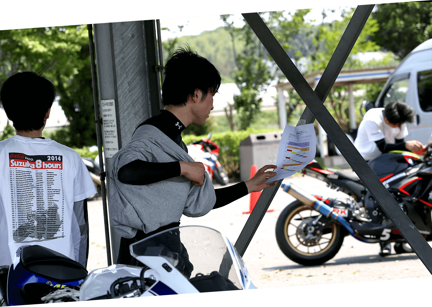 サーキットでは観客席からコースをはさんだ内側のエリアをパドックとよびます。パドックにはピットとよばれるガレージのようなエリアが並んでいます。各々に気に入った場所に陣取って、マシンの走行前の準備をします。バックミラーをはずして、灯火類にテープを貼って、ゼッケンをつける。さぁ、これからサーキットを走るんだぞと、気分が盛り上がってくる瞬間です。