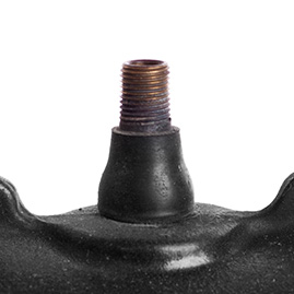 タイヤには 「車両を支える」「駆動力、制動力を伝える」「方向を転換・維持する」「路面からの衝撃を和らげる」という4大基本機能を備えていることが必要です。この4つの基本機能を備えているものが「弾力性のある空気の容器」であり、みなさんもご存知の空気入りタイヤとなっています。