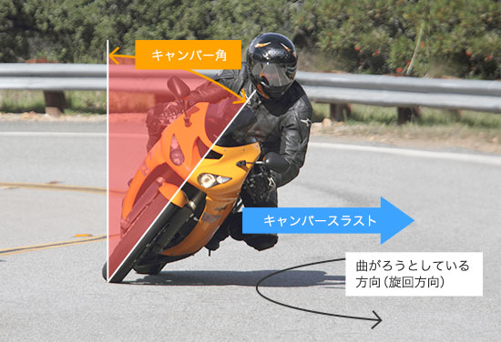 一般乗用車のキャンバー角は車両に対し±0.5°程度(プラスは車両外側、マイナスは車両内側にタイヤが傾きます。)であるのに対し、二輪車両は最大45°~50°にもなります。