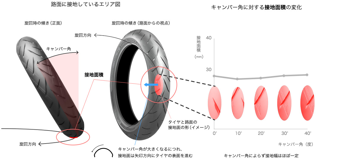二輪車用のタイヤは、直進時でも、曲がるときでも、どんなバンク角でも接地面積が大きく変化しないように設計されています。