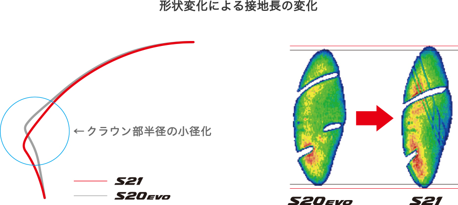 フロントタイヤのクラウン形状を小径化する事で、コーナリング時の車両を傾けた状態におけるタイヤと路面の接地面が車両前後方向に長くなり、これによって車両を旋回させる力(キャンバースラスト)が増大、軽快なコーナリング性能の向上に貢献する。