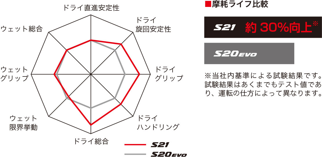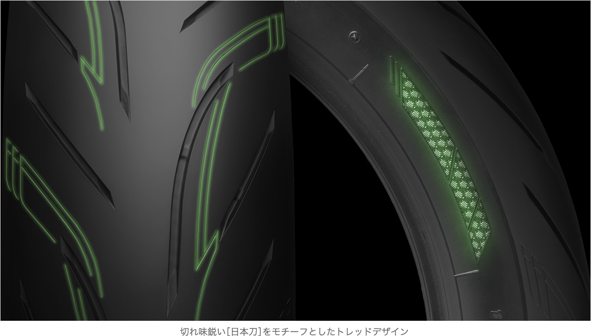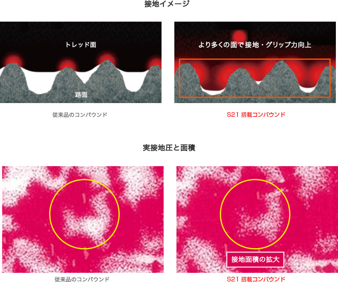 コンパウンド設計を分子レベルから見直し、ミクロレベルでのタイヤと路面の接地性を向上させたコンパウンドを開発。このコンパウンドを、コーナリング時に重要となる、フロント及びリアタイヤのショルダー部分に採用し、コーナリンググリップ性能が向上した。