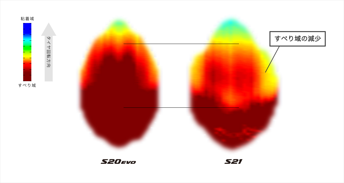 リアタイヤの構造設計にULTIMAT EYE™を活用することで、これまでの解析技術では見えていなかった接地面におけるタイヤが路面を滑る挙動を詳細に把握することができ、滑り域を大幅に減少させる事に成功。それによって摩耗が減少し、約3割の摩耗ライフ向上を実現した。