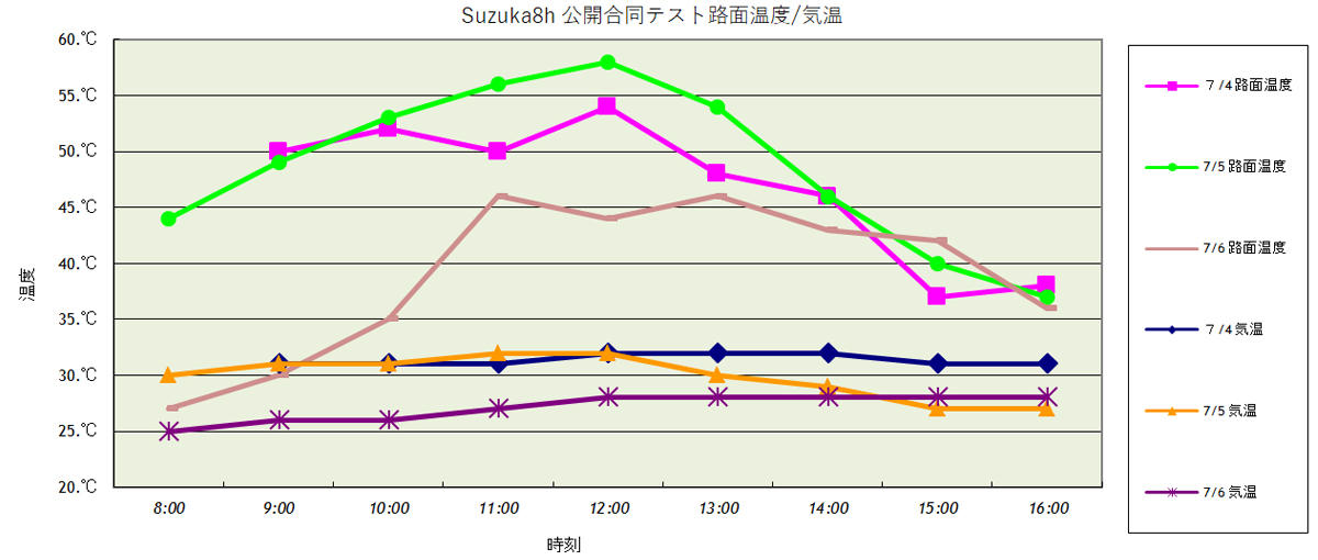 公開テストは三日間天気に恵まれ、気温と路面温度は下記の通りでした。