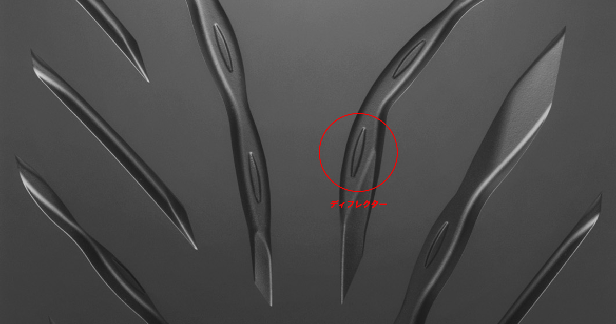 これに対し、T32のパルスグルーブは、ご覧のように、一つの溝の中にも幅が太いところと細いところがあり、脈を打つような形状となっています。さらに溝幅が太いところの溝底部分には「ディフレクター」と呼ばれる「島」を設置しています。
