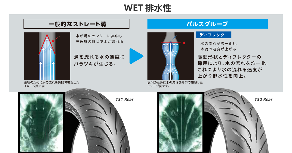 たしかに、実際にT32を店頭で陳列されているのを見て、違和感を覚える方もいらっしゃるでしょう。パルスグルーブを導入したT32は、これまでの二輪車用ツーリングタイヤとしては一見して異彩を放っています。
