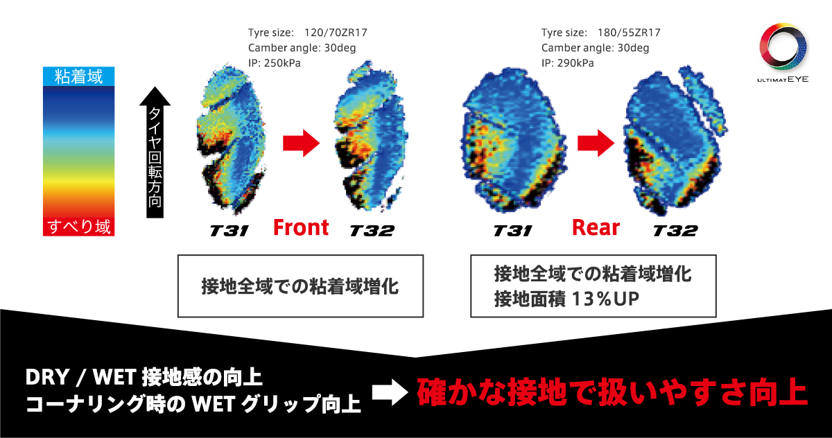 これは、T32の方が、接地面の水を効率的に排除でき、ウエット路面でも(T31より)しっかりと接地できることを表しています。