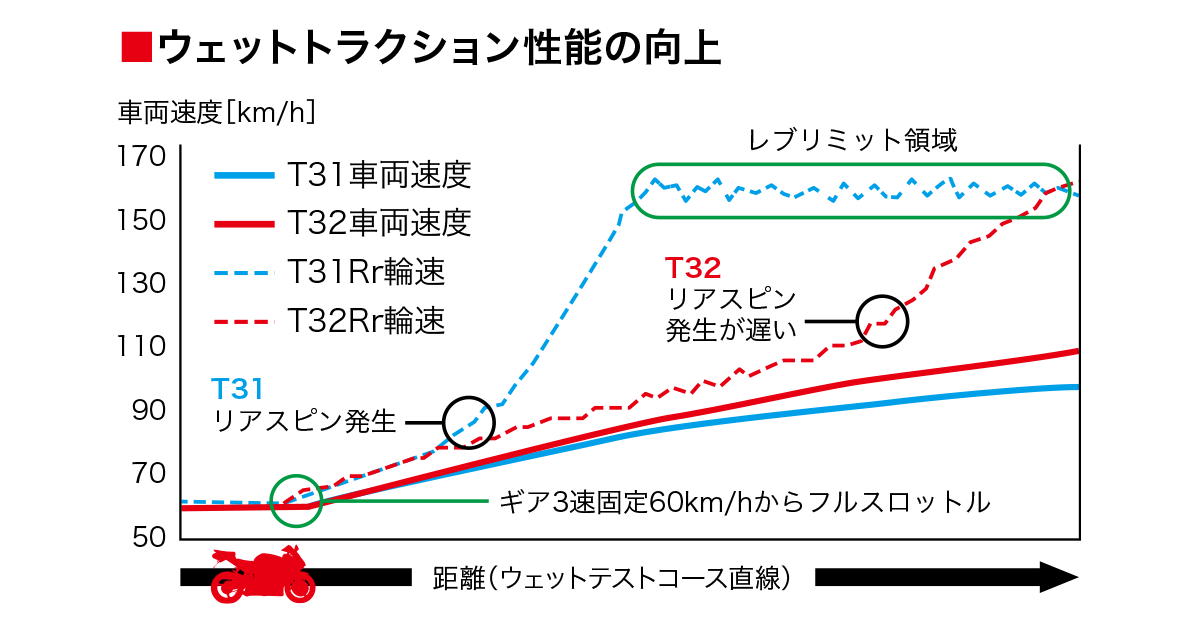 距離に対して、T31は急激にリアタイヤの回転速度(輪速)だけが上昇しています。これはT31のリアタイヤが早い段階から空回り(スピン)しているのに対し、T32は、スピンの発生が遅く、路面をしっかりと捉えていることを示しています。