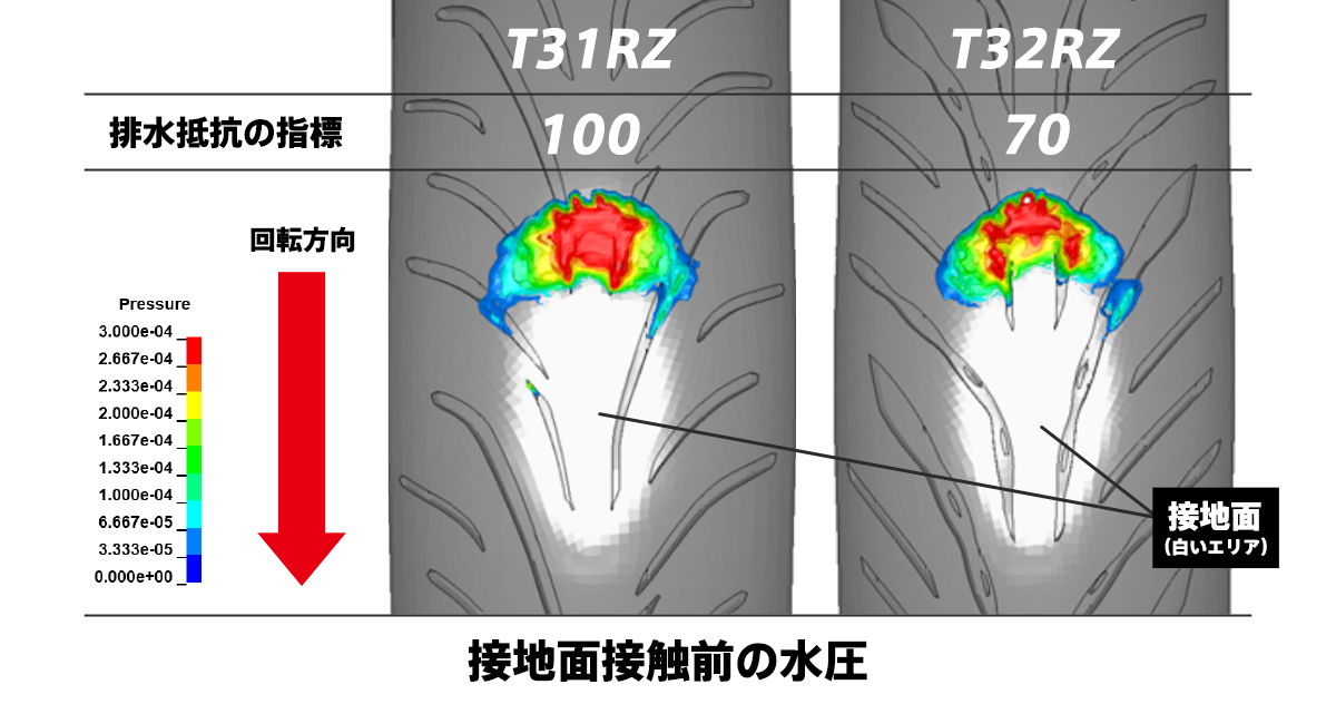この図は、コンピューターシミュレーションを用いて、ウエット路面を走行した時の接地面周辺の水圧分布を計算したものになります。色が濃い(赤い)ほど、その部分の水圧が高いことを示しています。 水圧分布を比較すると、T31よりもT32の方が赤い部分が少なく、色のついた面積が小さいことが分かります。