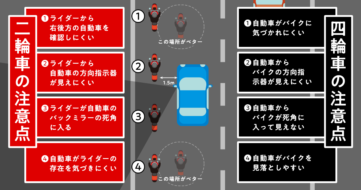 バイクで走行中に、こちらは存在をアピールしているつもりでも、ドライバーがこちらの存在に気付かず、車線変更したり、右折動作に入ったりして思わず接触しそうになったことはありませんか? その原因はドライバーの不注意、確認不足だと言えるでしょうが、できれば私たちライダーが必要以上に注意することで、不要不急な事故は事前に防ぎたいものです。 そこで、あらためて「ドライバーの死角」について確認し、私たちがどのように見えているのか、また、見えていないか、を考えてみましょう。