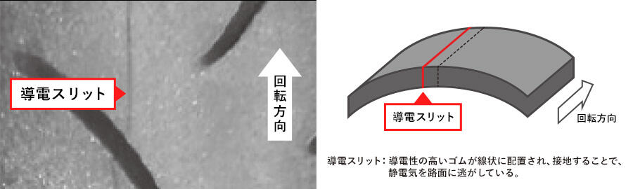 そこで、 導電性の高いゴム(導電スリット)をトレッド面に線状に露出させ、蓄積した静電気を放出しやすくしています。