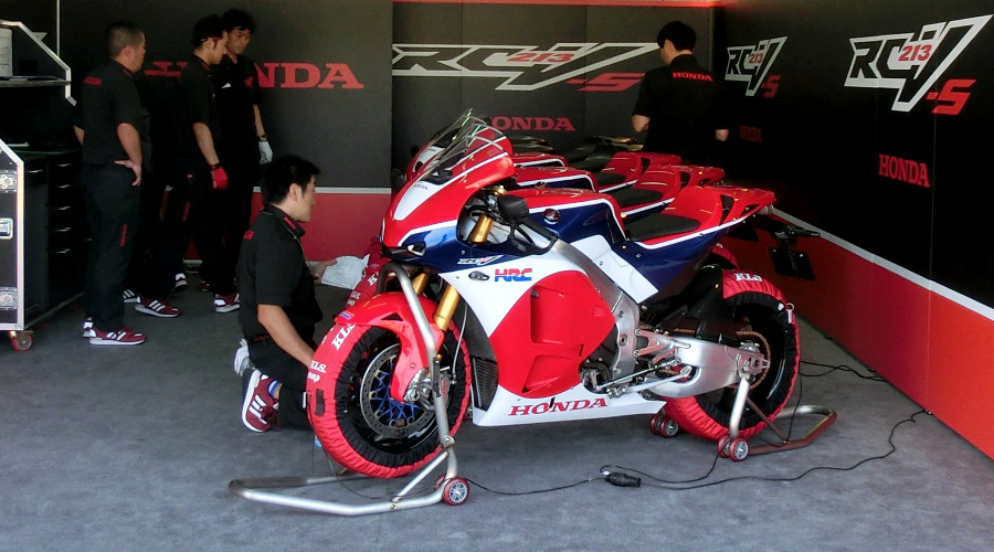 RC213V-Sと初対面。まさにMotoGPマシン!ピットボックスに整然と並べられて既に臨戦態勢!