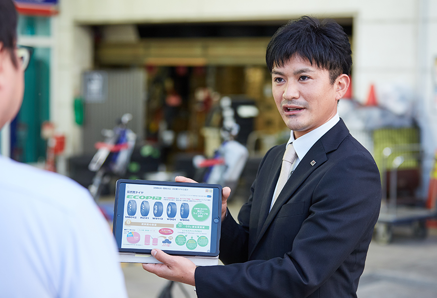 セールス職は主に運送会社・バス会社などの法人のお客様を定期的に訪問し、タイヤの状態を確認し、その時々に合った最適なタイヤを提案することでお客様に貢献します。 しかし、ただ単にタイヤを販売するのではありません。お客様が抱える個別の経営課題を把握し、その解決に向けて活動し、お客様からの信頼を獲得、win-winの関係を築きあげることがセールス職の使命です。サービス職