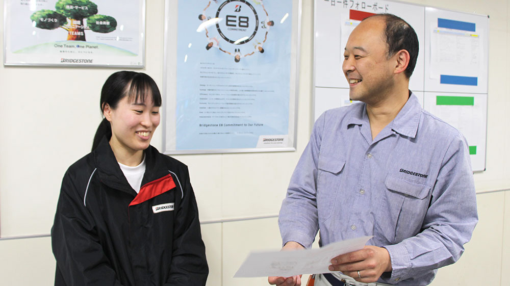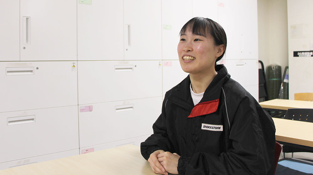高校の時から部活でバレーをしており、事務系というよりは身体を動かす仕事がしたいと思っていました。そうした中で、自宅の近くに工場があったことで、身近でありながら詳しくは知らないタイヤという製品を作っているブリヂストンに興味を持つようになりました。また偶然にも、一つ上の先輩がブリヂストンに勤めており、女性でも働ける職場なんだと思えたことも、当社を選んだ理由の一つになっています。工場なので、女性社員の割合は決して高くはありませんが、先輩たちの方から積極的に声をかけてくれるため、コミュニケーションは取りやすかったです。元々人見知りな性格もあったのですが、入社から3年経った今では、自分からどんどん話しかけにいけるぐらいみんなと打ち解けることができました。