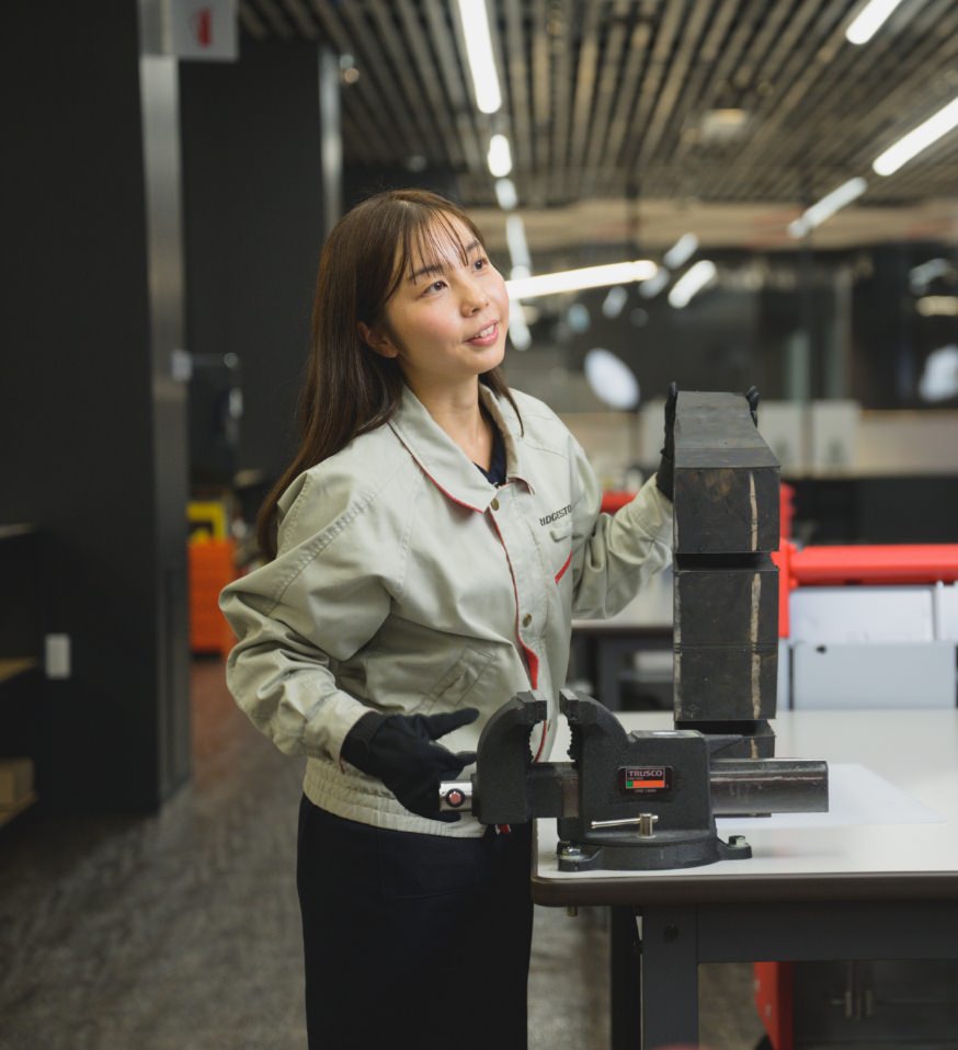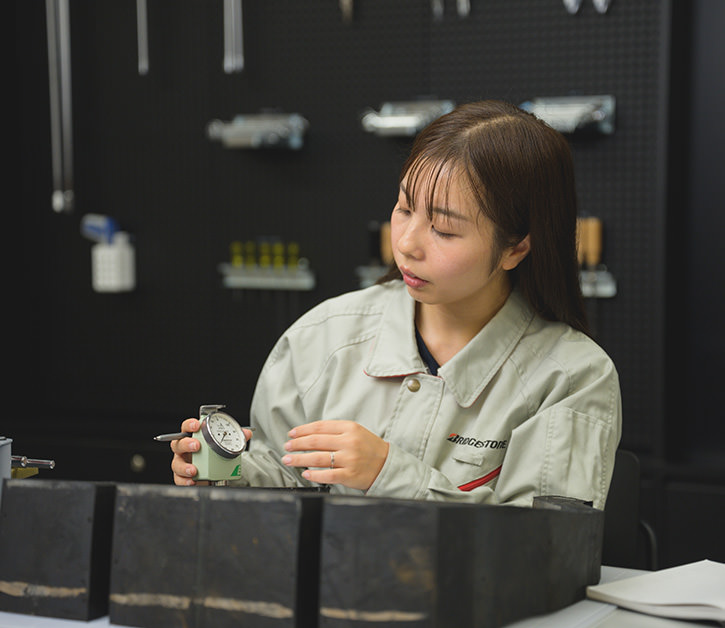 私は、大学院1 年の時にブリヂストンのインターンシップに参加。世界のトップメーカーでありながら自社製品の性能をさらに向上させようと、モチベーション高く研究活動に取り組む皆さんの姿に心をひかれました。またその時に、女性の管理職にお会いでき、女性の技術系総合職が何人も活躍されていたこともあって、自分のような女性の機械系エンジニアも働きやすい職場だと確認できたことも、入社の後押しとなりました。