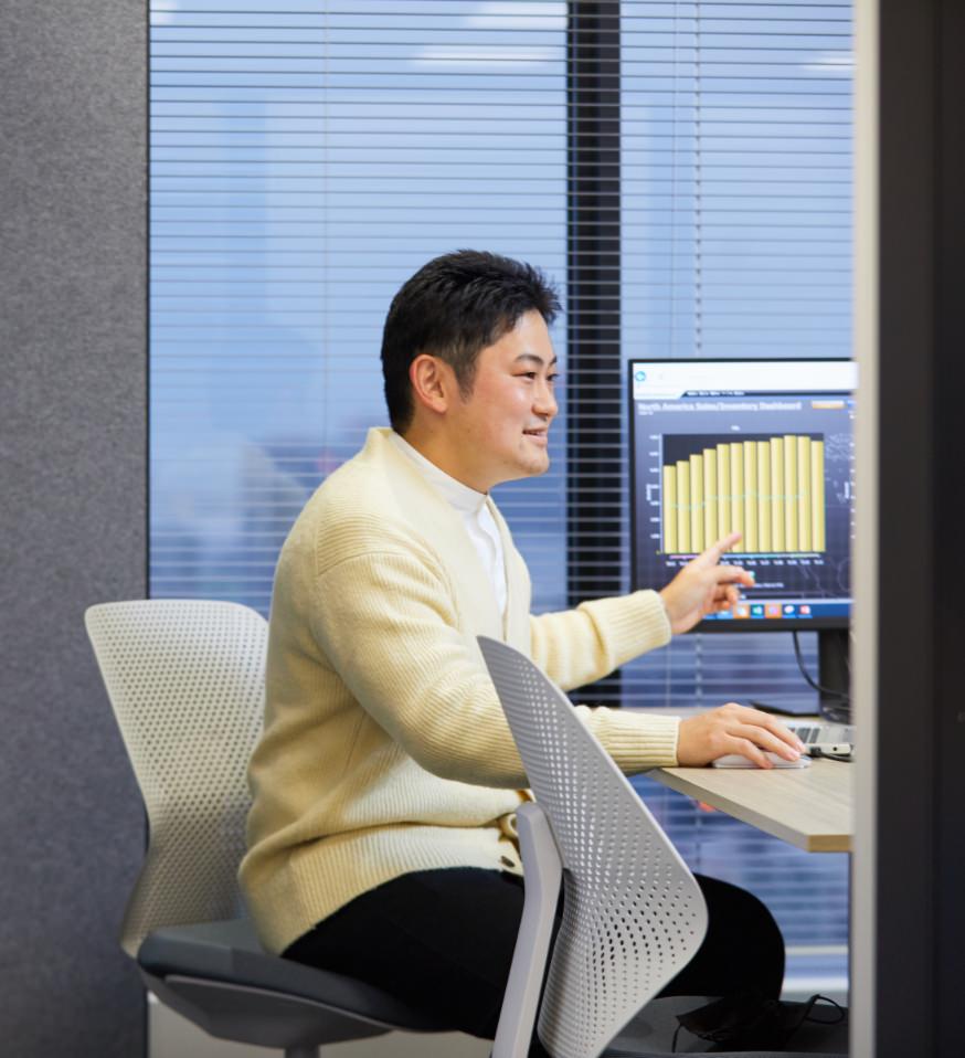乗用車用タイヤのグローバル中長期供給体制検討を担当しています。当社は世界中に生産拠点を持っていますが、これまでの販売データから、各グローバル市場へどの工場で生産して供給するのがいいのかを、市場の要望やコスト、工場の生産能力などを踏まえて決めていく仕事です。私は乗用車用タイヤの売り上げの40%以上を占めている米州市場向けの供給体制検討を担当しています。そのため、米州拠点のSCM(サプライチェーンマネジメント)を担当している同僚との打ち合わせはもちろんのこと、アジア、EUの仲間とも密に連絡を取りながら仕事を進めています。