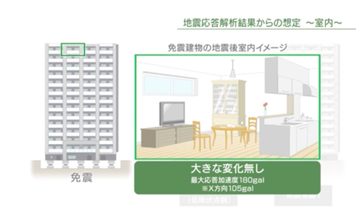 大地震の際には、建物の損傷以外に室内の家具などが転倒してしまう恐れがあります。免震建物の場合、免震装置の働きによって建物に強い揺れを伝えにくくするため家具などの転倒防止に効果があり、安全性の向上に寄与することができます。