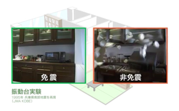 この映像では、振動台実験により実大サイズの住宅を実際にあった地震波で加振した実験映像をもとに、免震建物と非免震建物の室内の様子がどのように違うか比較することで、免震建物の効果がご覧いただけます。