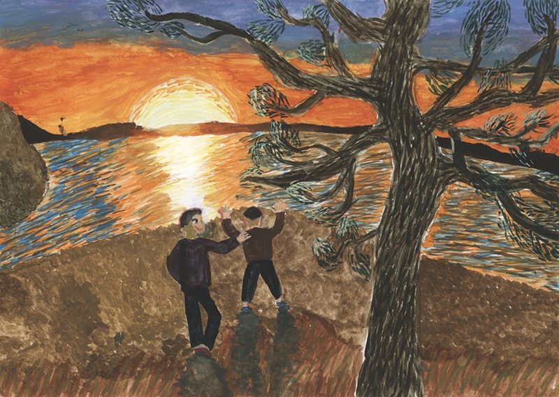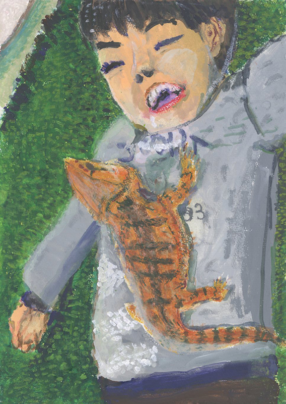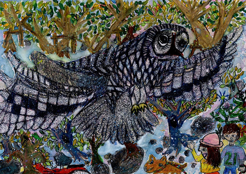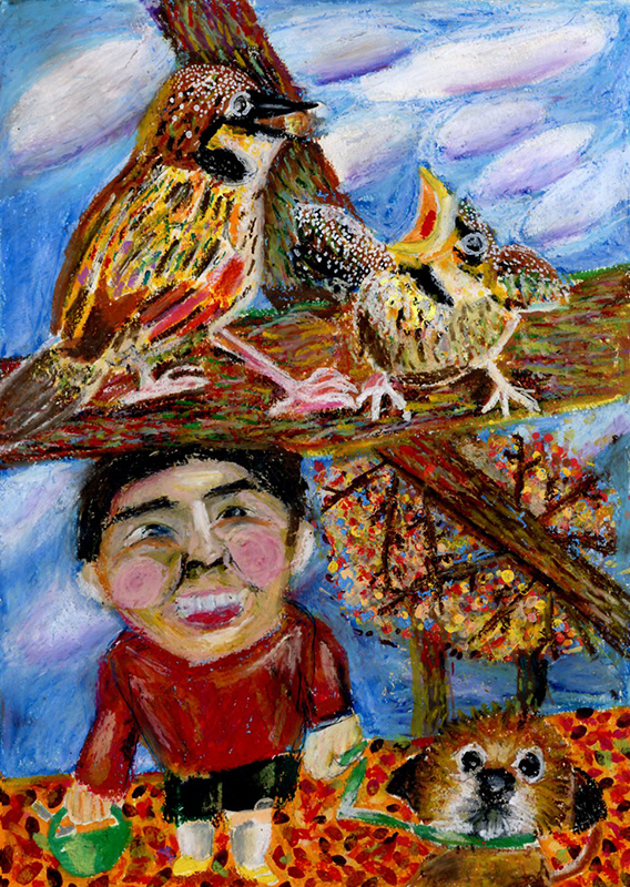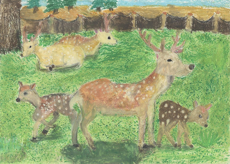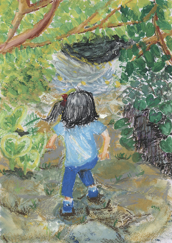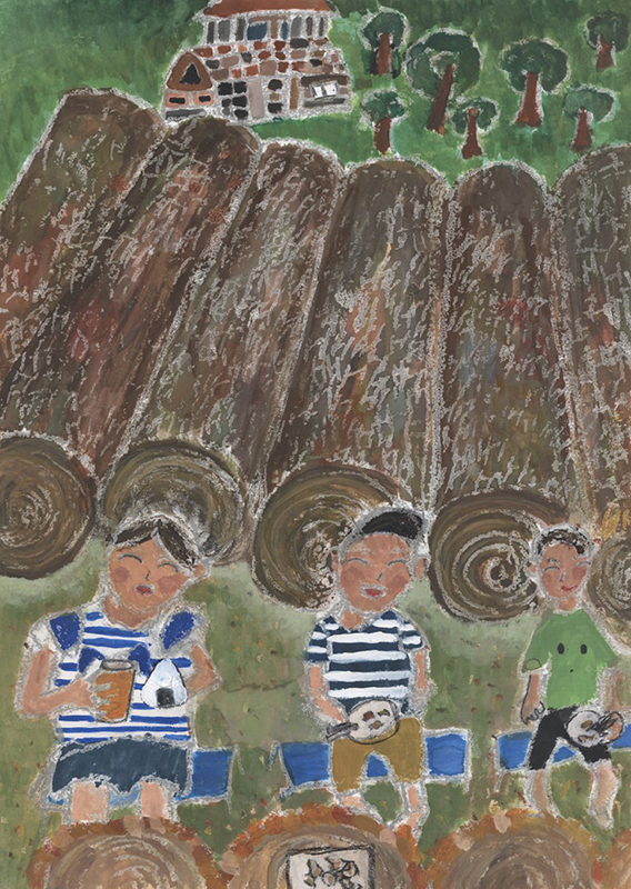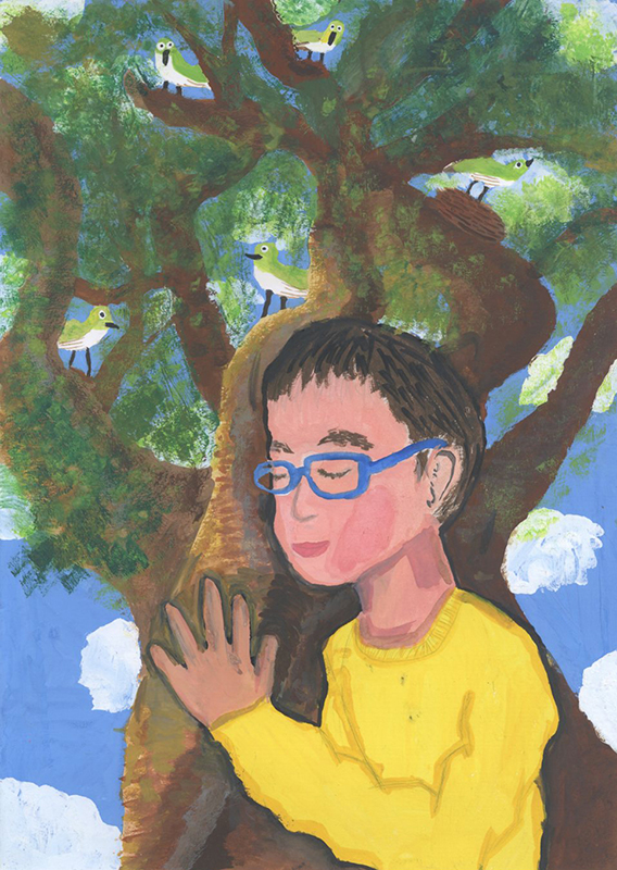 家の近くに天然記念物のシラカシの木があります。ぼくたち3兄弟は、そこでよく遊びます。ぼくたちの成長をいつも大きくて優しい気持ちで見守ってくれているように思い、描きました。