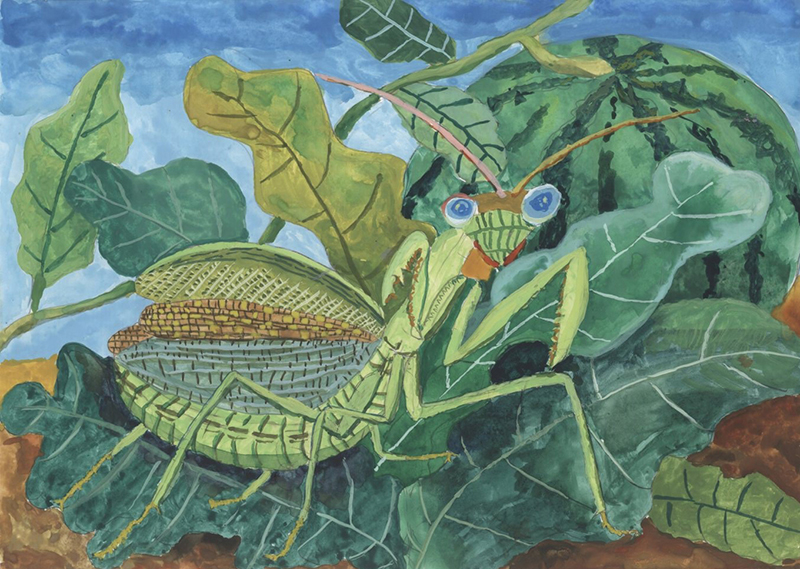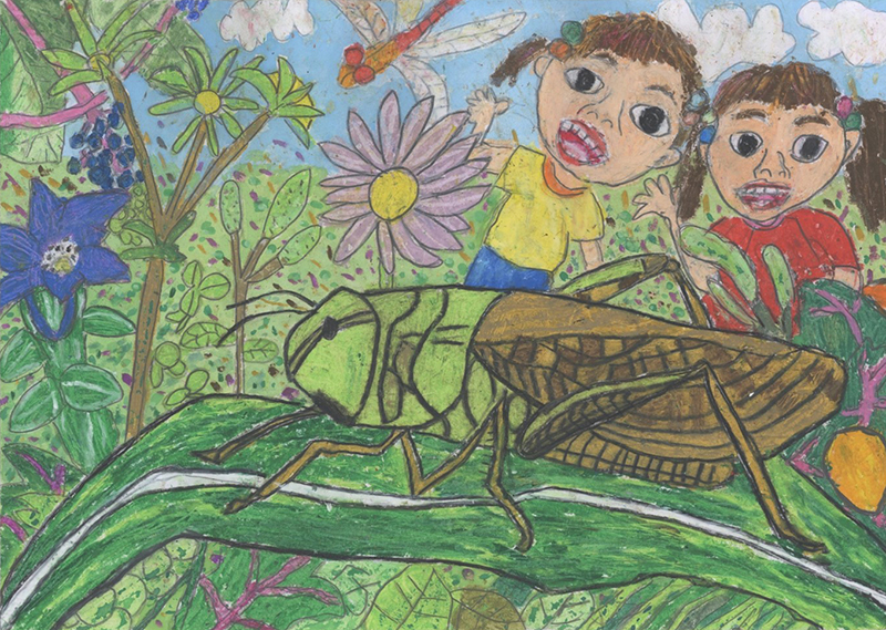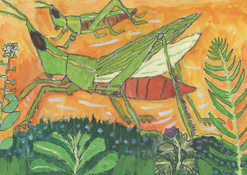 お姉ちゃんと散歩に行ったとき、トノサマバッタを見つけました。でも、あっというまに、とても高く飛んで行ってしまいました。大きな茶色い羽がかっこよかったです。