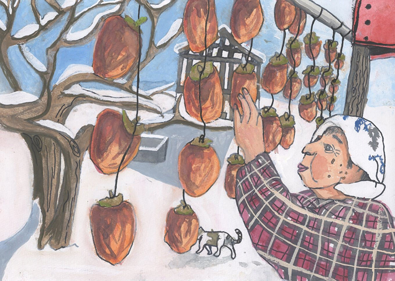 冬が近づくと、おばあちゃんがつるしている、干し柿。時には動物に食べられたりする。今年はなぜか1つもとられなかった。太陽にあたるだけですごく甘くなる。不思議な事ばかりだ。ぼくが感じている事を伝えたい。