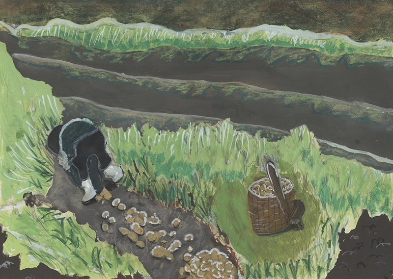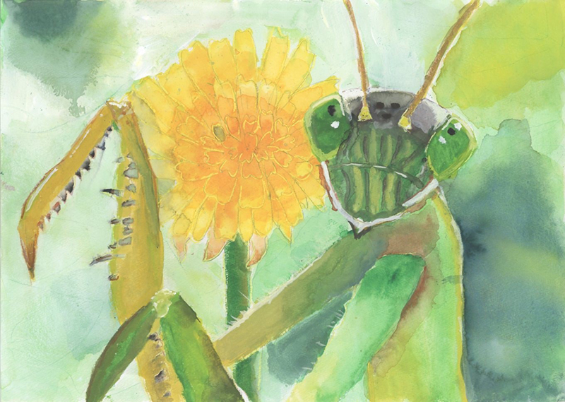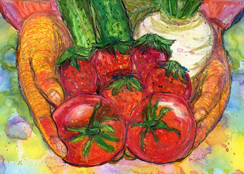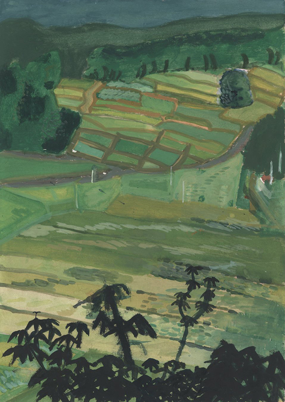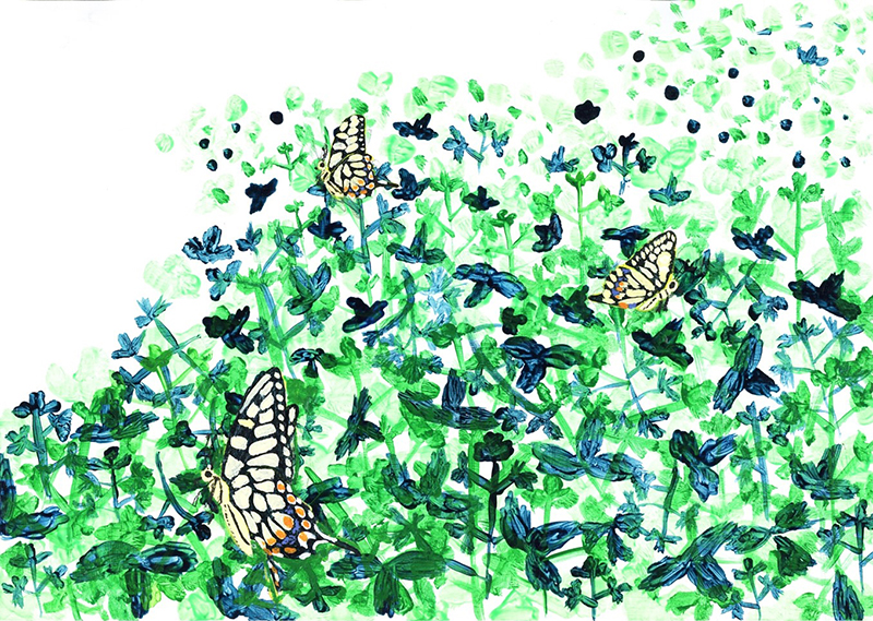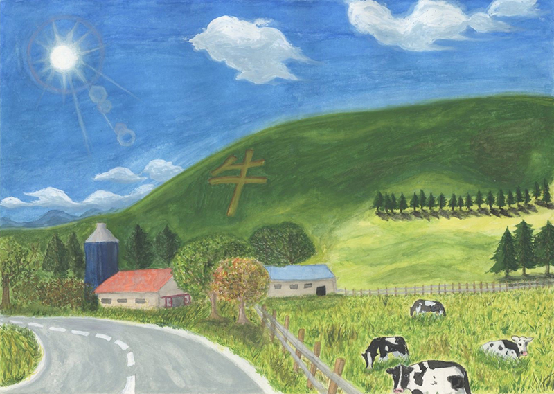 私は旅行に行く時、電車の中や、高速道路から見える、田んぼの青々とした風景を見ると、とてもおちつきます。大好きな風景なので描きました。