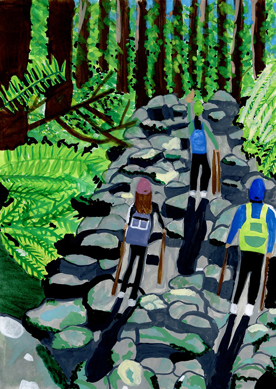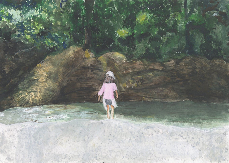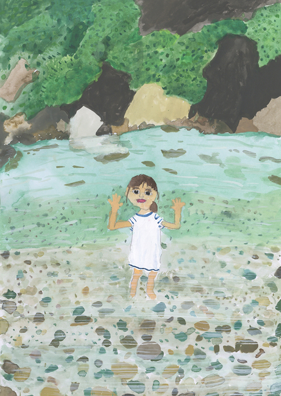 大すきなおきなわの山です。光かがやくはっぱと草、いろいろな形の石でできたみどりのトンネル。そこは、とってもしぜんゆたかなので、この絵をかきました。