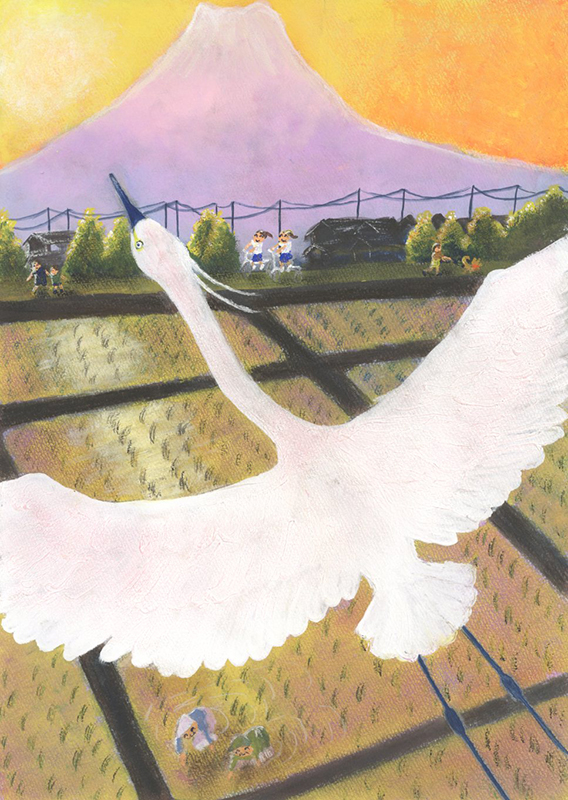 木更津に住んでいた時、友達と遊んで帰る時に見た夕日の富士山がとてもきれいでした。春になって、木更津に見に行ってもらいたいけど、行けなさそうなので、鳥だったら良かったなーと思って書きました。