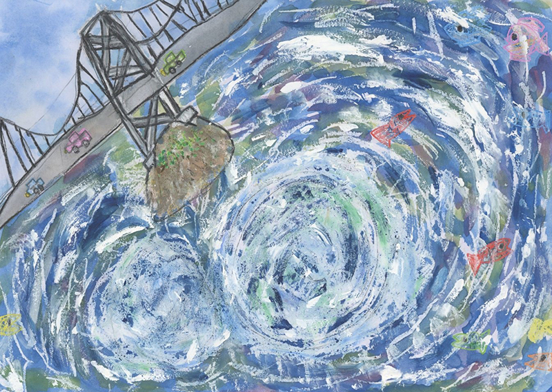 わたしのすんでいるとくしまけんには、なるとのうずしおがあります。上から見ると海がグルグル回っていて、はくりょくまん点です。