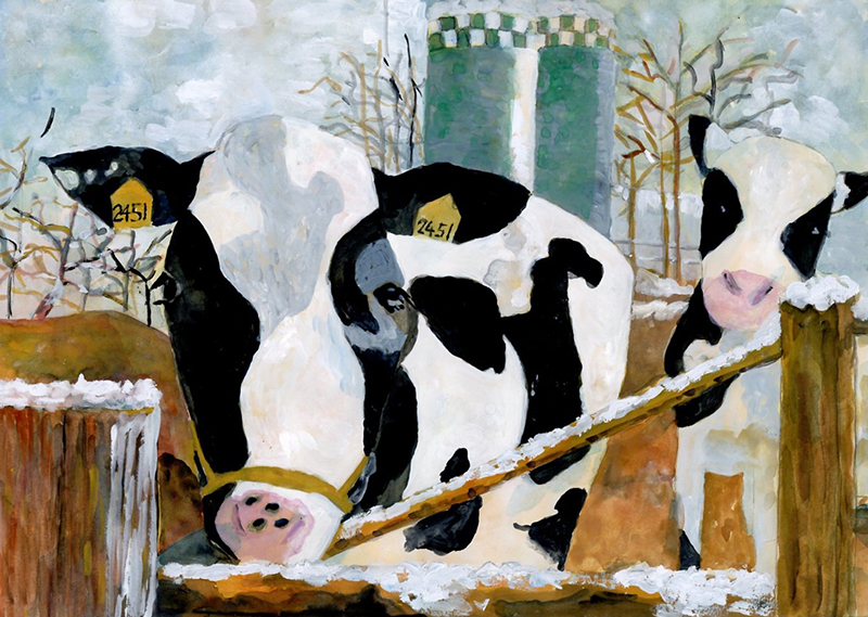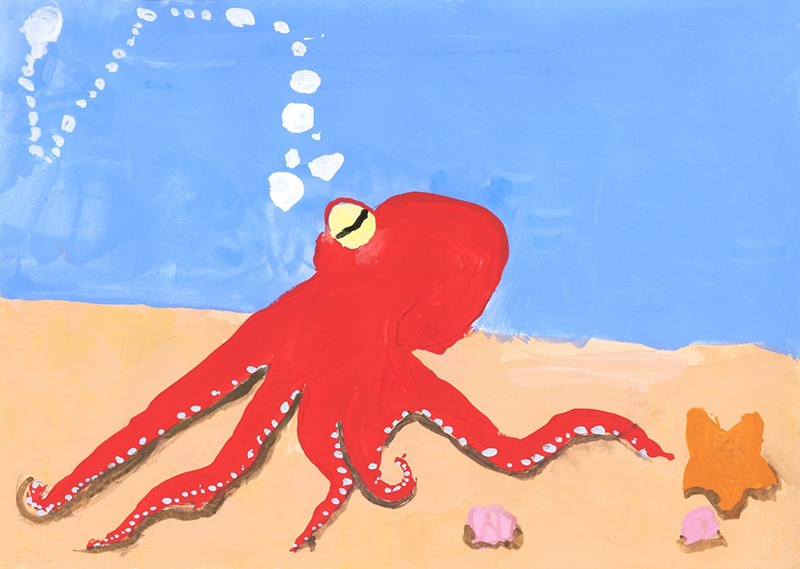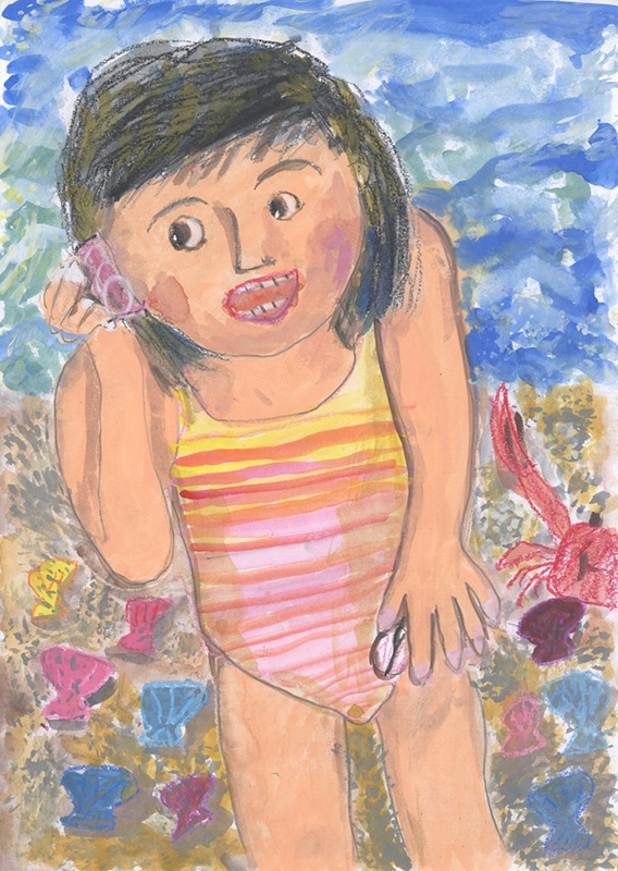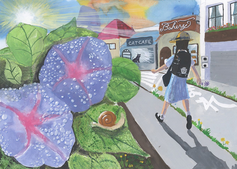 登下校の時、道ばたにさいている朝顔に朝つゆがついていて、それが日に照らされて光るので、きれいだと思い、この絵をかこうと思いました。
