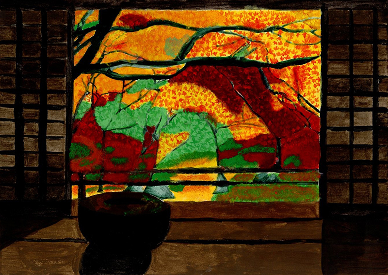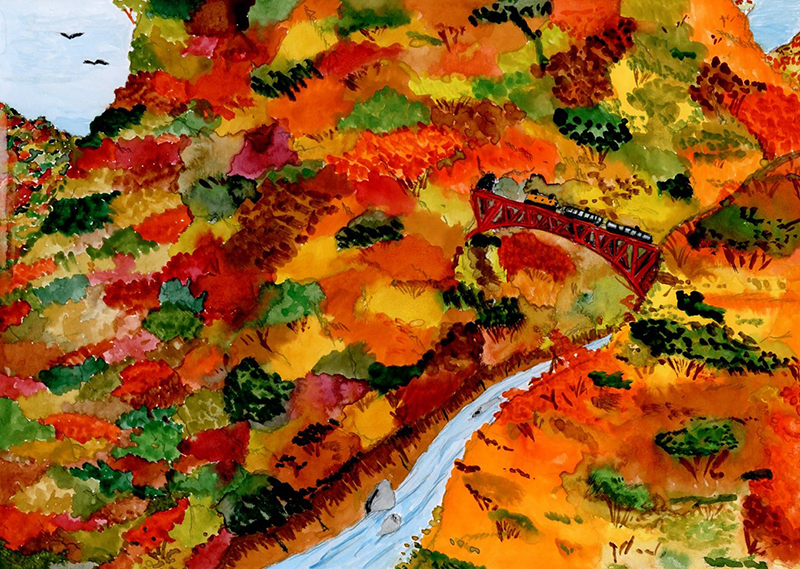 この絵は、私の祖父が生前写した写真を元に描いたものです。私はこの場所に、行ったことはないけど、写真を見て、色あざやかなもみじが印象に残り、私もぜひ行ってみたいと思いながら描きました。