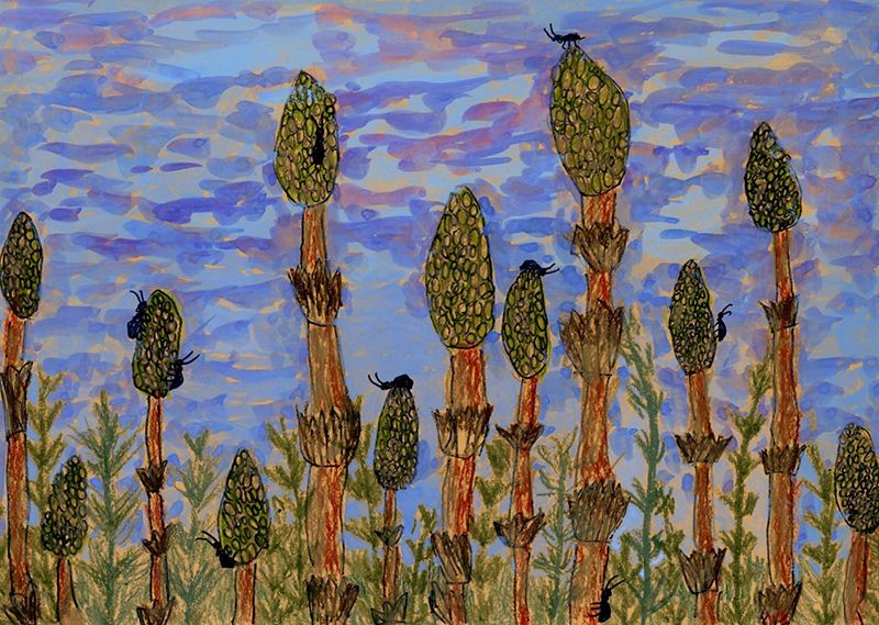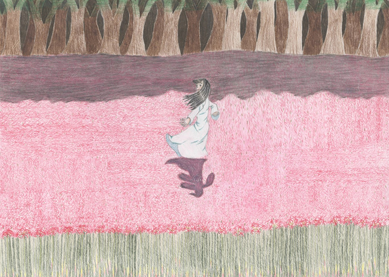 一本一本ただ植わっている木だけど、大きな木に耳を当ててみると、すごく小さな木の鼓動が聞こえて生きていることに気付き親しみを感じました。その時の様子を描きました。