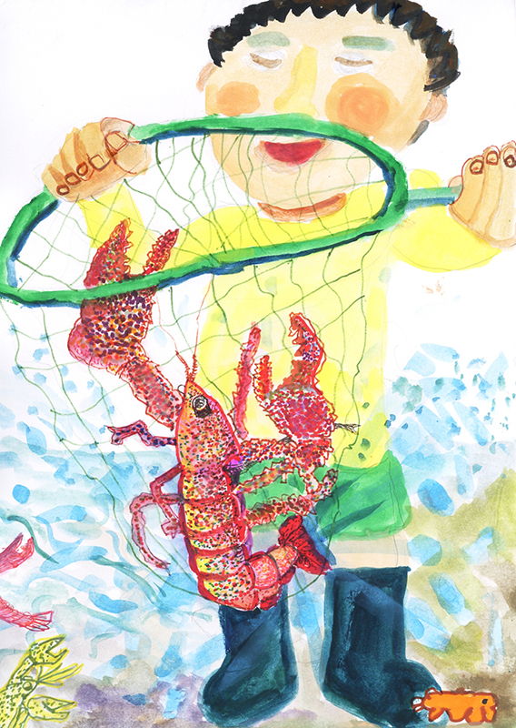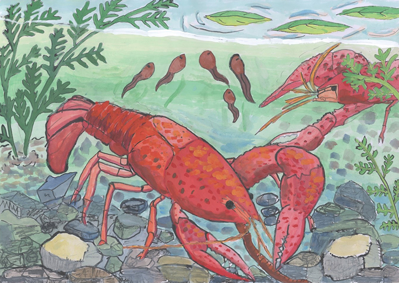 近くに、きれいな水がわいている泉の公園があります。福徳泉といいます。コロナの自しゅく期間に、ふとのぞくとまっかなザリガニがいました。そんな中に元気にくらしているのを見てうれしくなりました。