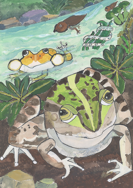 山の小川でトノサマガエルを見つけました。カエルは水中と陸上の両方でくらす両生類でたまごから少しずつ体を変えて成長します。ジャンプや泳ぎが得意です。ヘビが天敵です。気をつけてね!