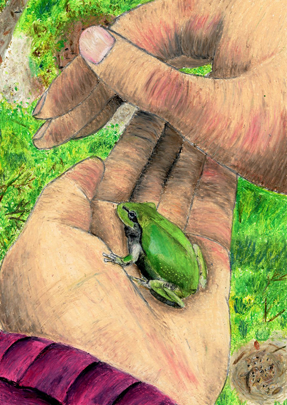 おばあちゃんと田んぼに行った時に、近くでアマガエルを見つけました。アマガエルはジャンプ力がすごいので大好きです。見つけた時は、とてもうれしくて手でおおいながら見せに行きました。