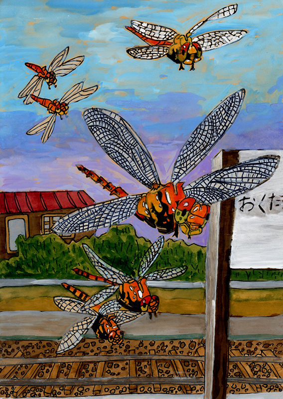 おくたまに行ったときに電車に100ぴきぐらいの赤とんぼが入ってきて、私はこんなにたくさんのとんぼを見たことがなかったからおどろいたのもあったし楽しかったから絵を描きました。