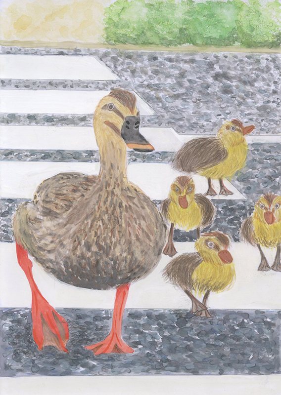 私の好きなテレビ番組で、毎年カルガモ親子のお引っ越しを特集しています。特に手に汗をにぎりながら見てしまうのが、道を渡る場面なので、今年もみんな無事に引っ越しできるように祈りながら描きました。