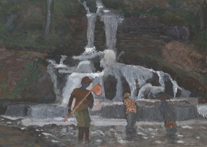 木と岩の色を重ねながら、色あいをよく見て、イメージに近くなるようにぬりました。岩のゴツゴツとしたところをかくのが難しかったです。