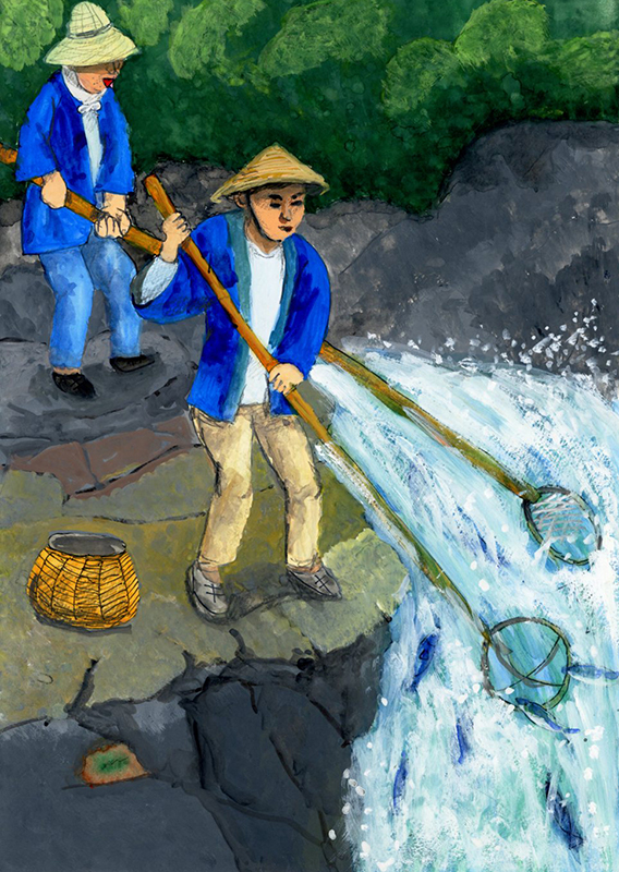 約400年間続く伝統を守りたいと思ったから。滝つぼに上ってくるアユをすくい上げる。漁法をやれる人が少なくなったから、この漁法を守りたい。