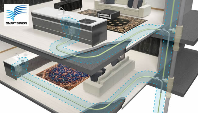従来の自然勾配による押し流し排水から、サイホン力を利用した無勾配での排水を可能とした『スマートサイホン』。