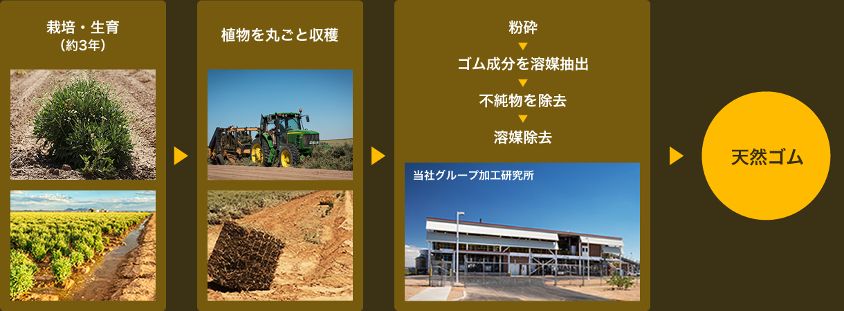 当社グループでは、栽培技術から、天然ゴム抽出技術、タイヤへの適用技術に至るまでの一貫した研究開発を行い、グアユール由来の天然ゴムの実用化を目指しています。