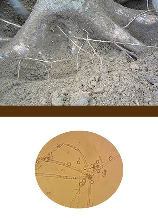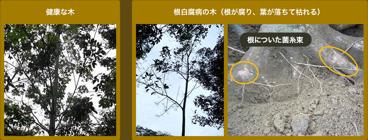 - ※1糸状菌の一種であるパラゴムノキ根白腐病菌(Rigidoporus microporus,ネッタイスルメタケ)が引き起こす病気。根に感染し組織を腐敗させることで、樹木を枯死に至らしめる。感染初期の発見が困難。現状では抜本的な対策がなく、発症した場合、罹病部位の切除、薬剤処理により対処する。