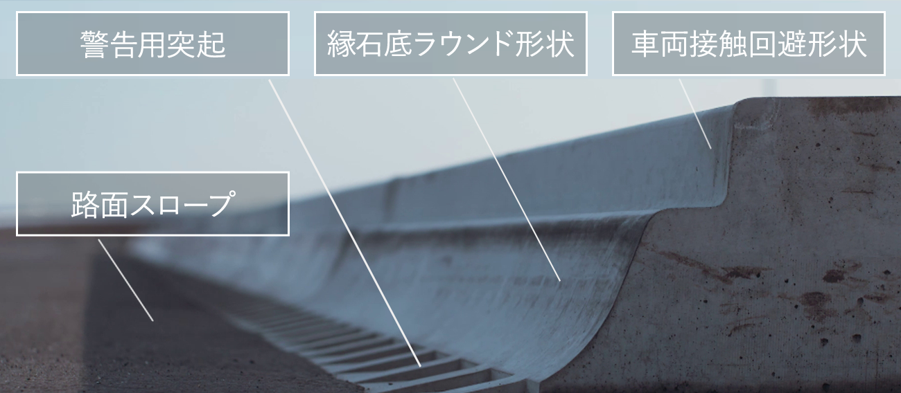 | 路面スロープ | 警告用突起 | 縁石底ラウンド形状 | 車両接触回避形状 |
