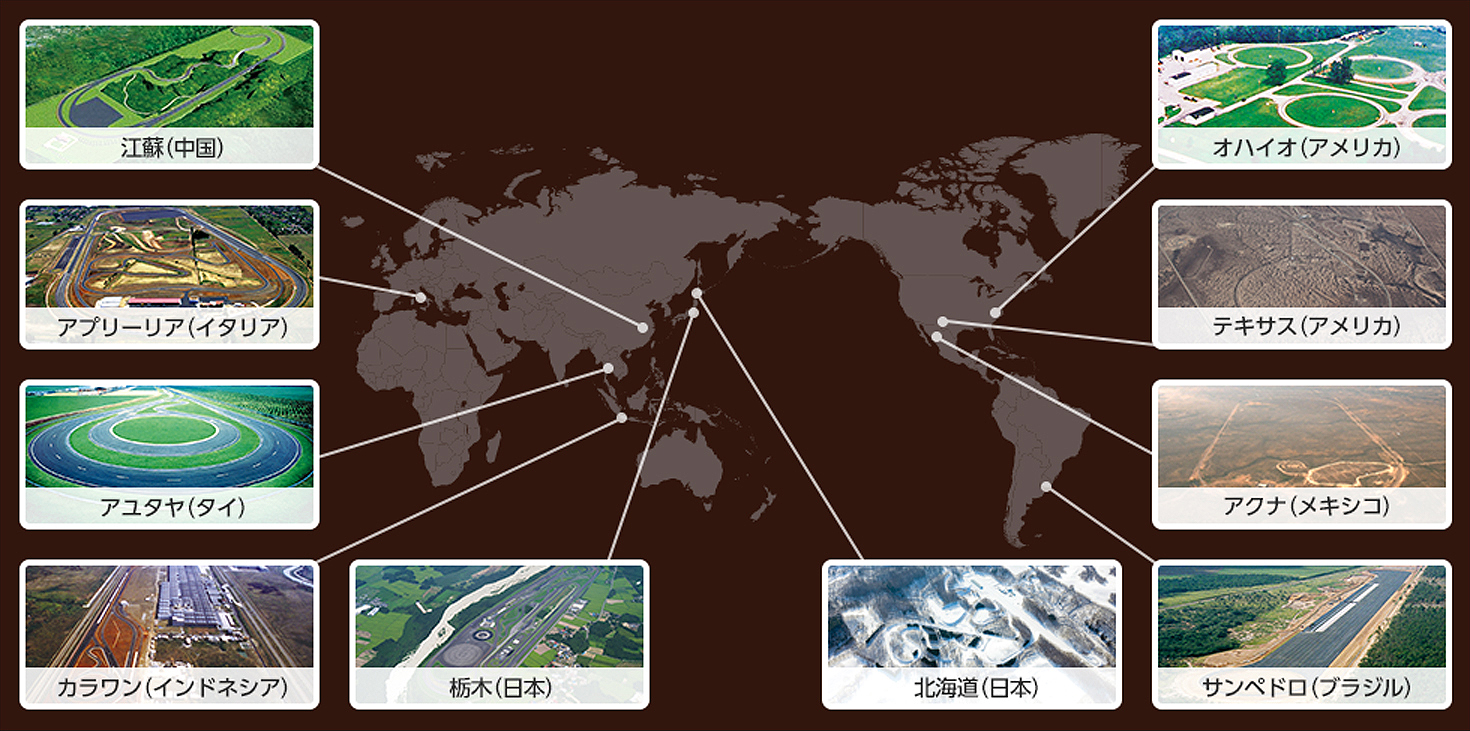 日本、北米、中南米、欧州、アジア、そして中国が保有するプルービンググラウンドで、各市場に即した走行条件での性能テストを行うことで、市場ごとの路面の特性に的確に対応できるタイヤを開発しています。