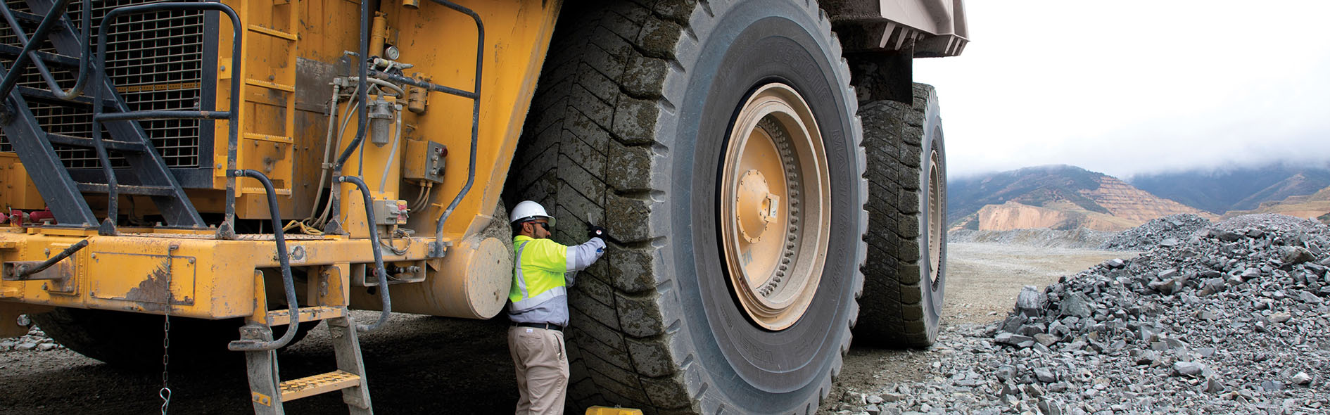 鉱山はタイヤにとって最も過酷な使用環境のひとつです。車両重量260トン、積載重量370トンの鉱山車両では、総重量を6本のタイヤで支えるため、1本あたり100トンもの荷重がかかります。そのような環境の中、一度の車両の稼働でより多くの鉱石を積載しより速く運搬して車両運搬効率を向上させることが、生産性向上のための重要な課題になっています。ブリヂストンでは、その課題を解決すべく、断トツの商品と断トツのメンテナンスサービス、断トツのサービスネットワークをリアルとデジタルで組み合わせることで、鉱山事業者の安全性・環境性・経済性・生産性に貢献する鉱山ソリューションを展開しています。