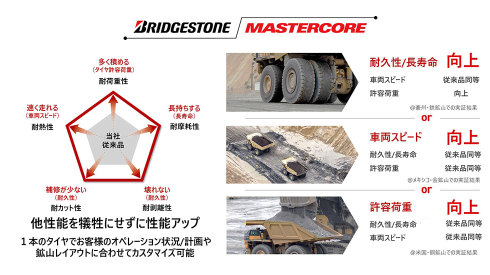 当社はこれらの技術を結集し、鉱山現場の生産性向上に貢献するORタイヤ「Bridgestone MASTERCORE(以下、MasterCore)」を開発しました。「MasterCore」は、他の性能を犠牲にすることなく強靭な耐久性能を実現し、お客様ごとに異なる鉱山の現場やオペレーションの計画に合わせて「カスタマイズ」することで、最適な性能を提供することが可能な断トツの商品です。世界中の主要な鉱山のお客様のテストマーケティングでは、お客様のニーズに対応した耐久性能の向上を確認しています。当社は、この断トツ商品に、すでに世界各地に展開している現場密着のサービスと車両の運行データやタイヤの温度・空気圧などの情報をリアルタイムで把握することが可能なセンサー技術を掛け合わせ、将来に向けて鉱山オペレーション全体を支えていくことを目指します。