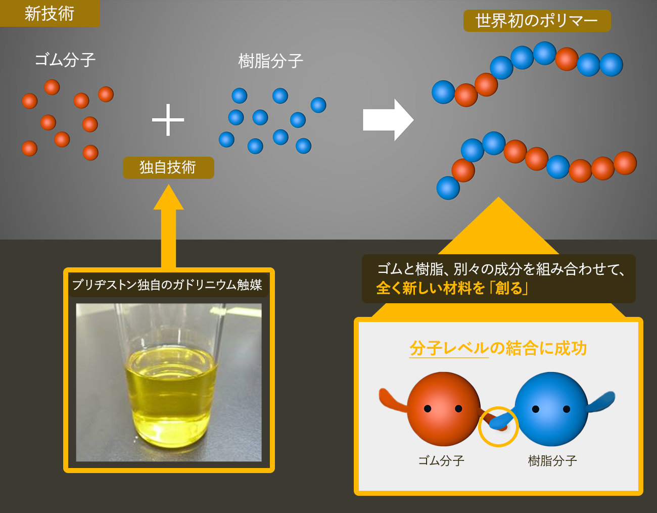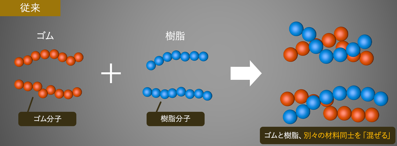 多くの物質は、「原子」という小さな粒子が結びついた「分子」で構成されています。ゴムと樹脂はそれぞれ鎖のように分子がつながってできていて、従来ゴムの分子と樹脂の分子を分子レベルで結びつけること(イラストの赤と青のボールが混ざった鎖を作ること)は極めて困難とされてきました。しかし、ブリヂストンでは独自の触媒(化学反応を促進する物質)を用いることで、ゴムと樹脂を分子レベルで結び付けることに成功しました。こうして生まれたのが、ゴムのしなやかさと樹脂の強靭さをあわせもつ新素材「SUSYM」です。