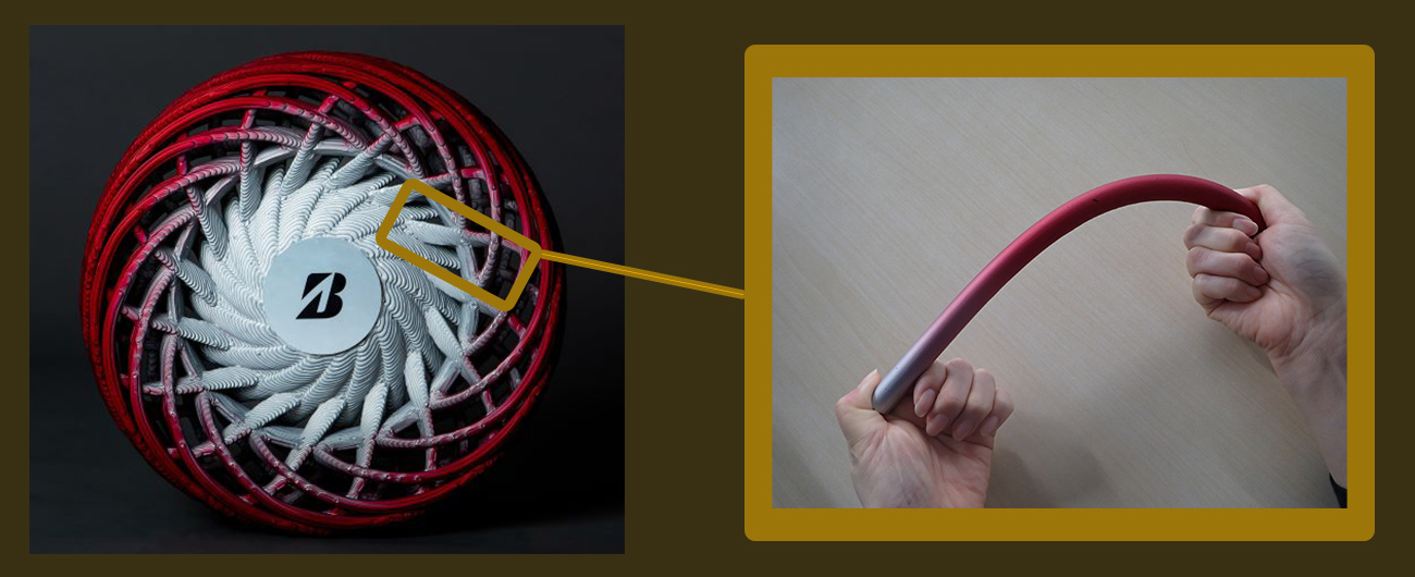 この「SUSYMコンセプトタイヤ」は、硬くて頑丈な銀色の部分から柔らかくてしなやかな赤色の部分まで徐々に硬さとしなやかさを変化させた「SUSYM」でできています。日本の伝統工芸である竹細工をモチーフに、特性の異なるゴムと樹脂が「SUSYM」となりシームレスにつながっていることを表現しています。このように、「SUSYM」を使うことで、これまでにないデザインを生み出すこともできます。